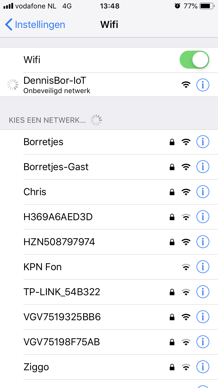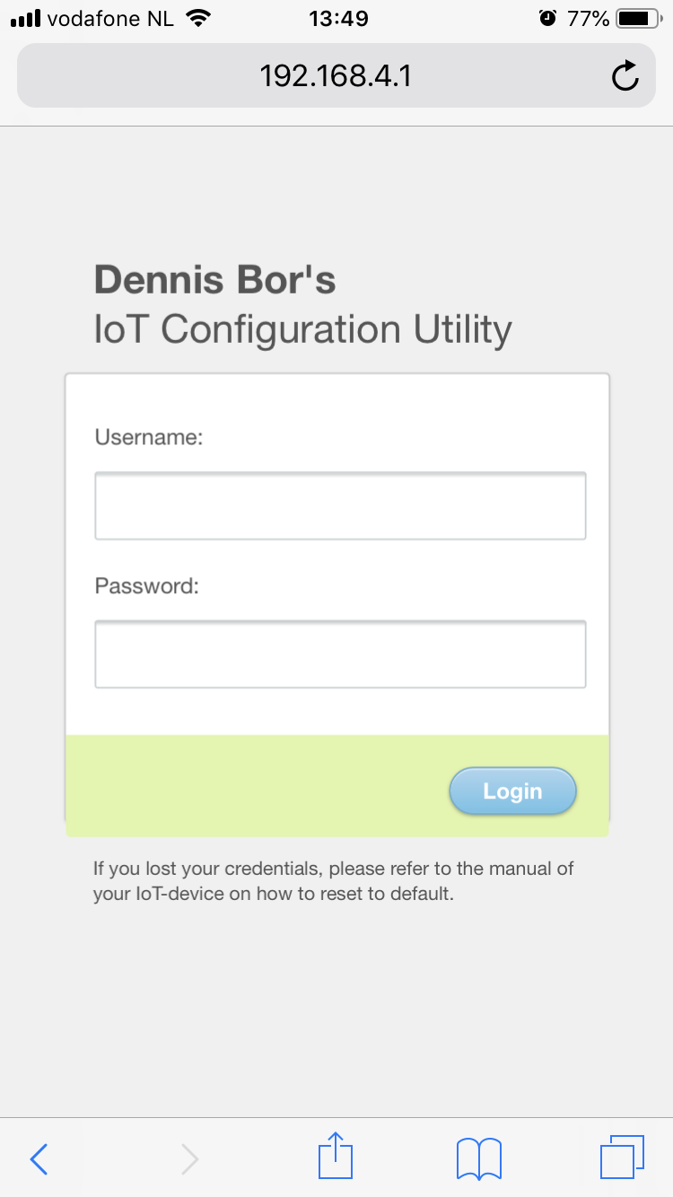 De module start op als open Access Point met SSID ‘DennisBor-IoT’ en is na verbinding door middel van een mDNS (multicast DNS) hostname (dennisbor-iot.local) of IP-adres (192.168.4.1) te bereiken.