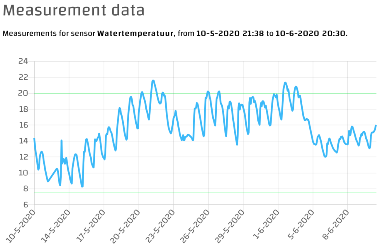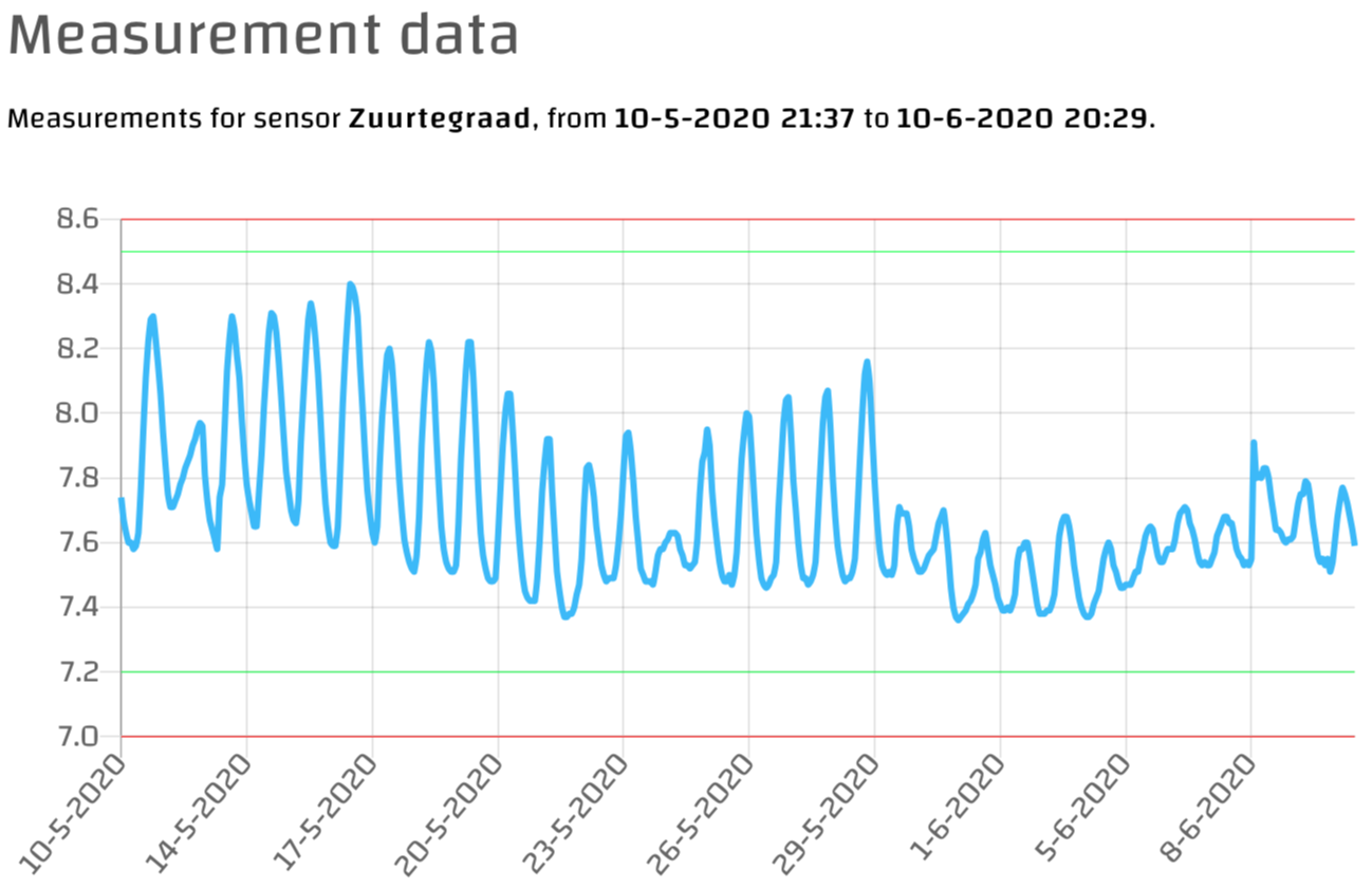 Onderstaande grafieken tonen de meetwaarden van afgelopen maand, waarbij in de grafiek voor sensor ‘Zuurtegraad’ duidelijk te zien is wanneer er chemicaliën tegen draadalg gebruikt werden.