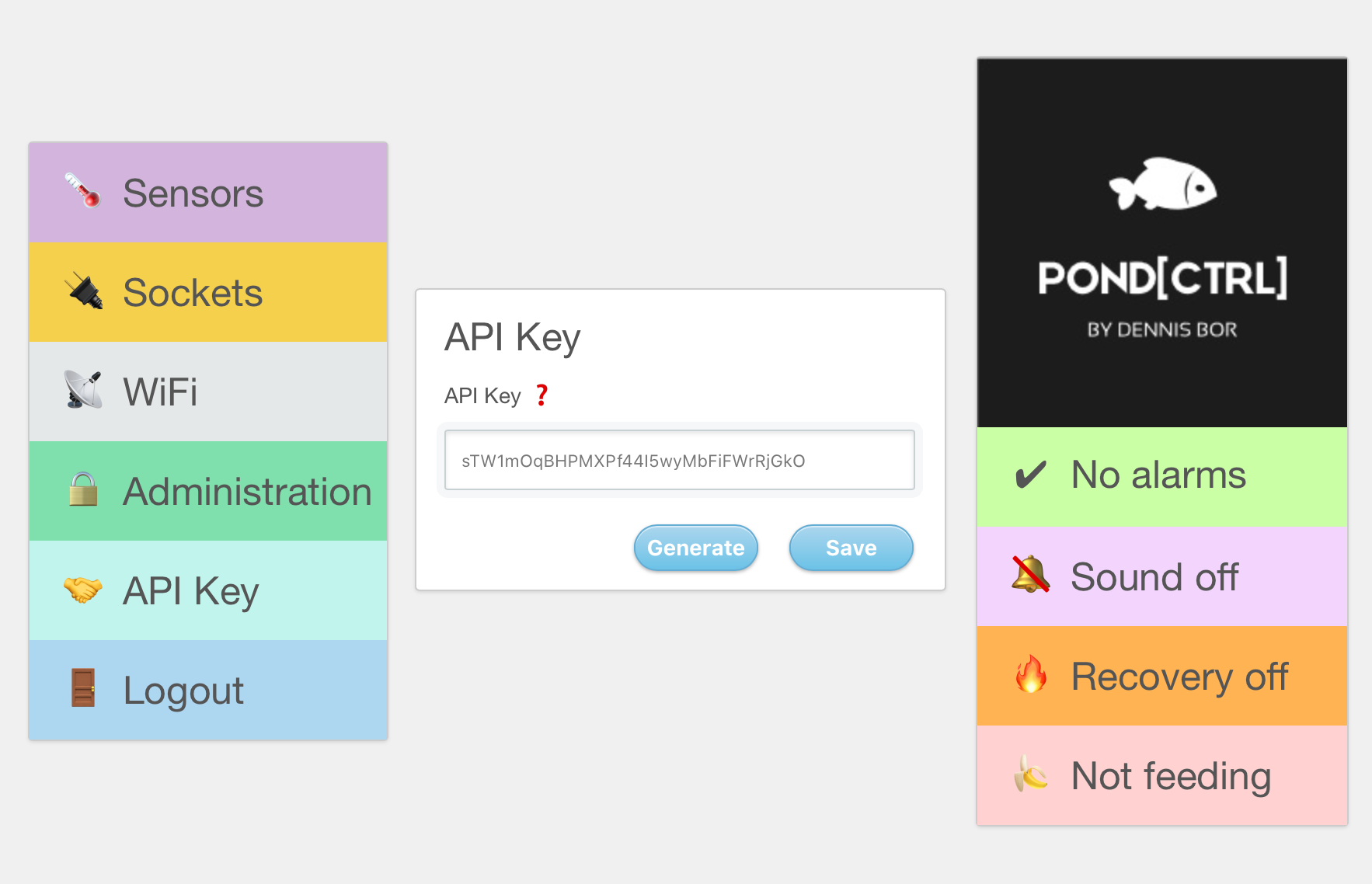 Om Pond[CTRL] met andere apparaten te laten communiceren zonder handmatig in te hoeven loggen, als voorbereiding op de gewenste HomeBridge-koppeling, ondersteunt de firmware nu autorisatie door middel van een API-key. Standaard is er geen API-key ingesteld waarmee API-autorisatie uitgeschakeld is. Zodra de key ingesteld is kunnen apparaten door middel van deze key alle functionaliteit van Pond[CTRL] bedienen.